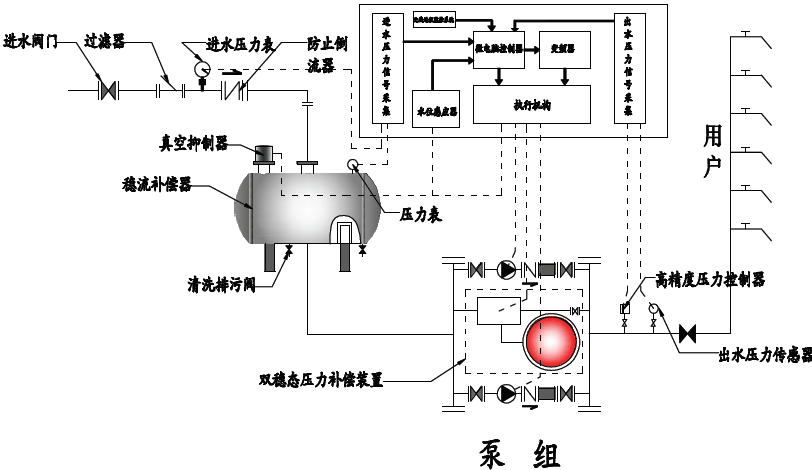 另外如設備原理圖所示,通過微機控制、雙穩(wěn)態(tài)壓力補償裝置及真空補償系統(tǒng),使本設備可以和自來水直接串接,因水泵工作的疊加原理,使設備可以充分利用自來水原有的壓力,增加了變頻調速給水設備的節(jié)能點。當自來水壓力不足致使壓力下降時,本設備通過真空抑制器及穩(wěn)流補償器中的檢測裝置采集穩(wěn)流補償器內的水位信號,通過微機控制真空抑制器及雙穩(wěn)態(tài)壓力補償裝置中的的特殊裝置動作,抑制負壓的產生,保證設備不對城市管網(wǎng)產生任何影響。