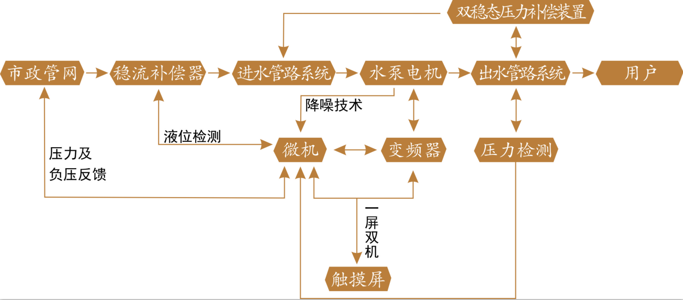 無負壓供水設備采用微機變頻技術、降噪技術、一屏雙機技術、雙穩(wěn)態(tài)壓力補償技術、負壓處理技術實現(xiàn)無負壓供水。通過觸摸屏顯示運行狀態(tài),通過微機控制、雙穩(wěn)態(tài)壓補償裝置及真空補償系統(tǒng),實現(xiàn)了與自來水管網(wǎng)直接串接,并且克服了對管網(wǎng)的不良影響。